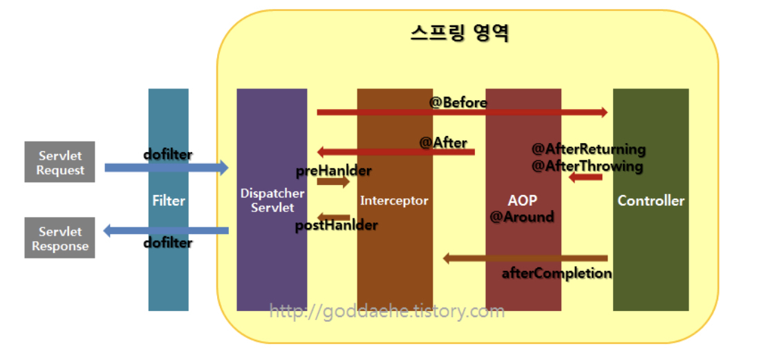 * 인터셉터 : 스프링의 DistpatcherServlet이 컨트롤러를 호출하기 전, 후로 끼어들기 때문에 스프링 컨텍스트(Context, 영역) 내부에서 Controller(Handler)에 관한 요청과 응답에 대해 처리한다.